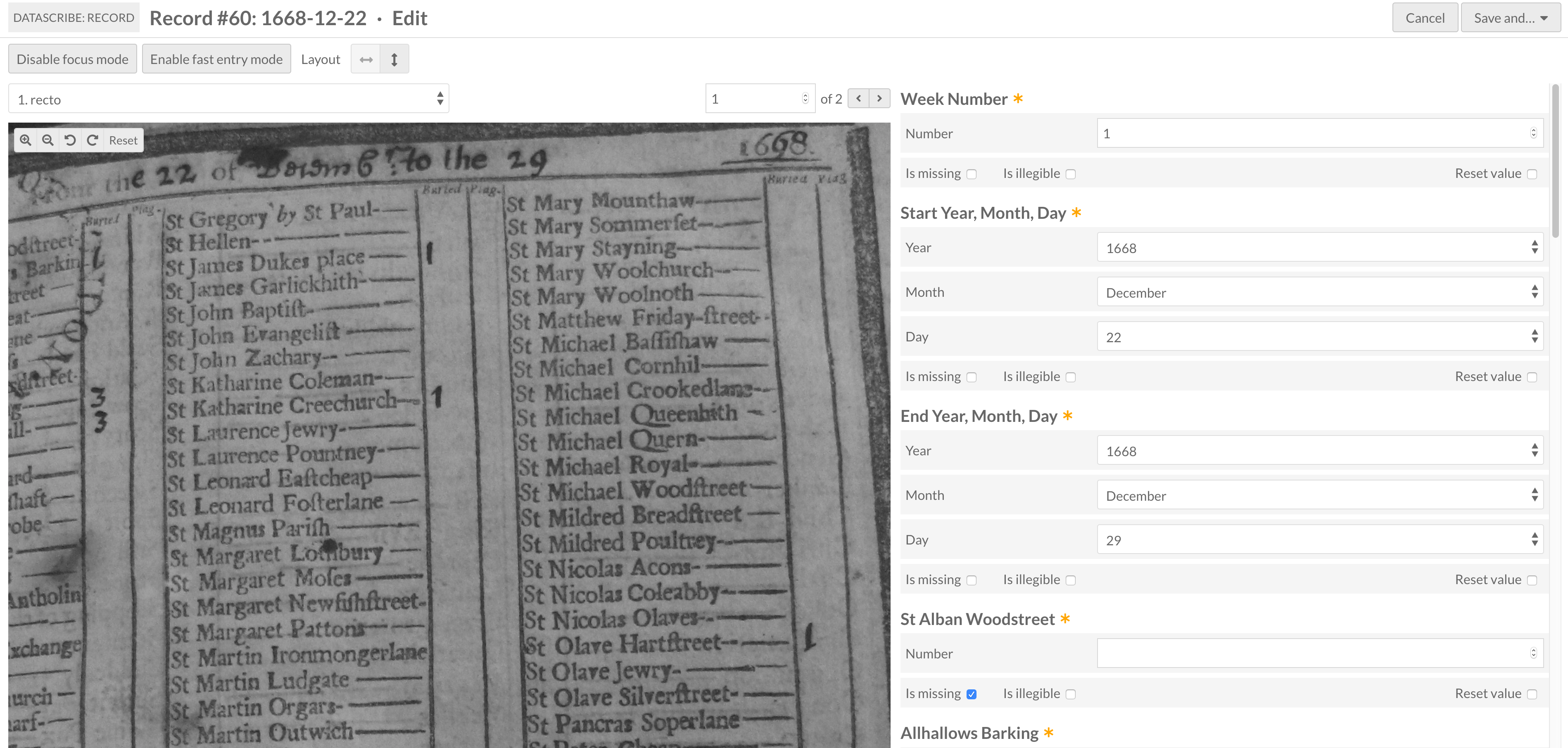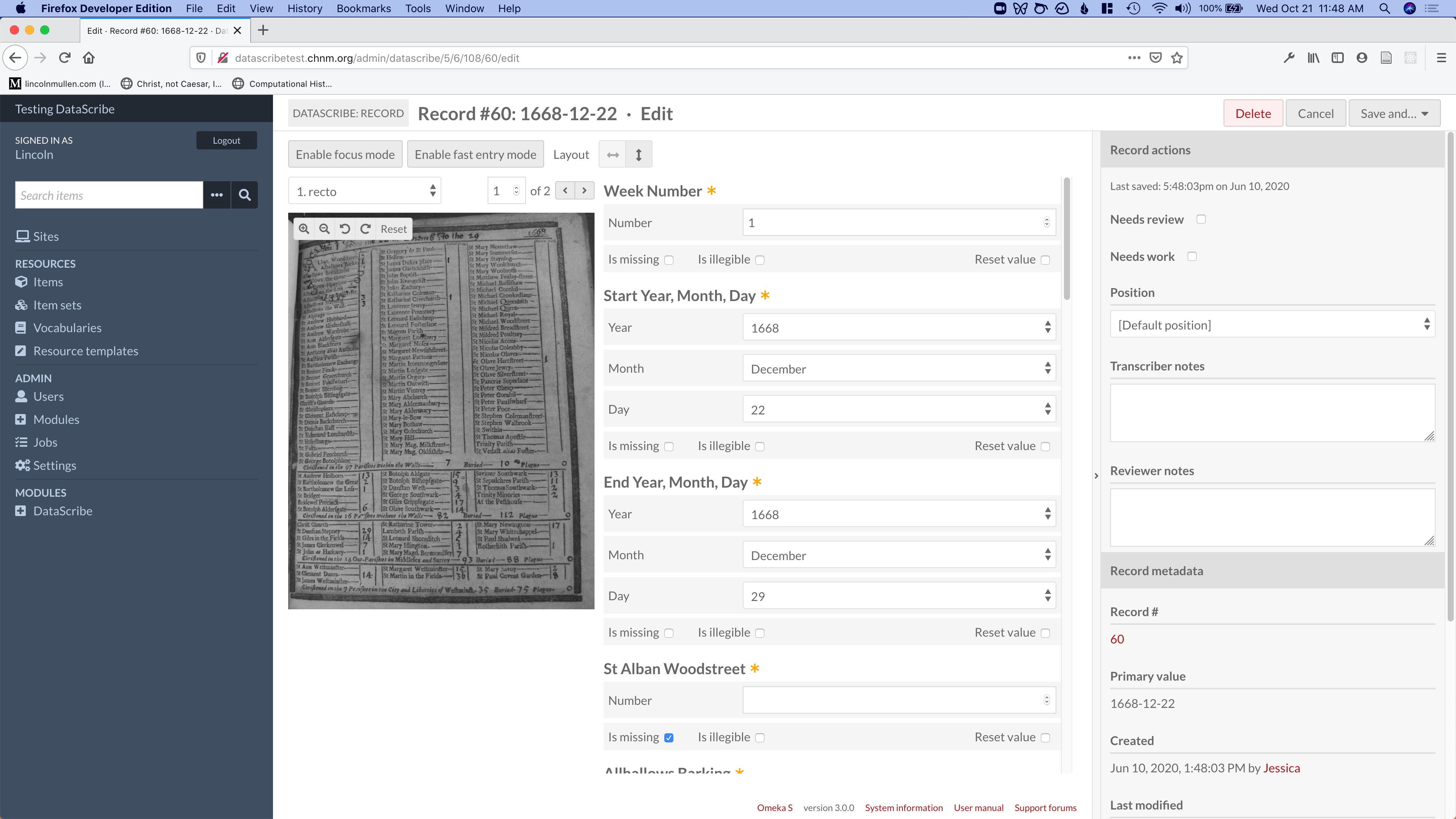 DataScribe allows users to see the documents they are transcribing, to enter the transcription into fields that ensure data accuracy and consistency, and to manage the workflow of the project.[/caption]