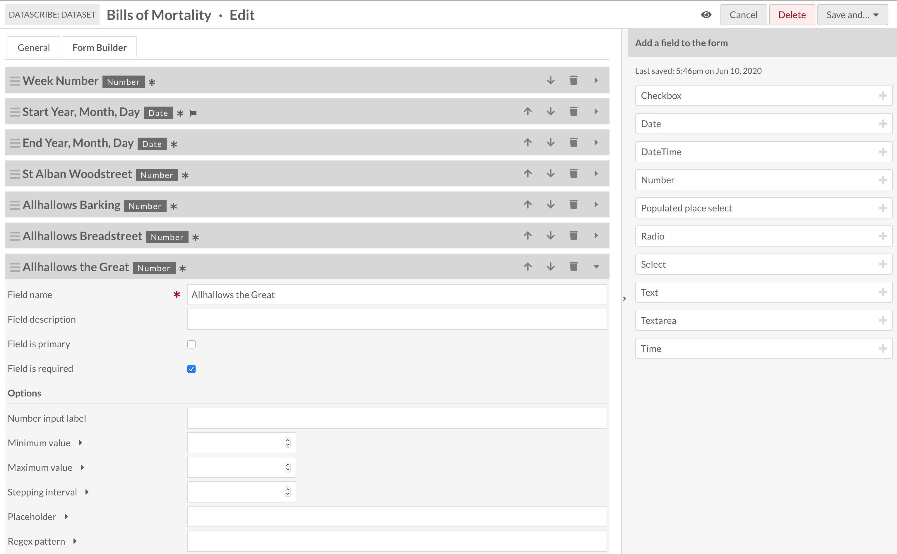 Project managers can use DataScribe’s form builder to define which fields should be transcribed and to decide which types of data, such as numbers, dates, and categories, should be associated with those fields.[/caption]