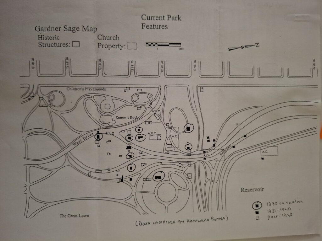 The publication of their work sparked a fire. Archaeologists began using Ground Penetrating Radar (GPR) to investigate the site, confirming that evidence of the settlement remained. Excavations followed.[15] Nan Rothschild and Diana Wall led a large archaeological study, beginning by overlaying the 1856 Egbert Viele survey over the existing structures of Central Park. Rosenzweig sent his notes to the New-York Historical Society, which produced the renowned 1997 exhibit, “Before Central Park: The Life and Death of Seneca Village, an Exhibition at the New-York Historical Society,” and a number of educational programs.[16] Since 1992, countless historians have cited The Park and the People, expanding on its coverage of Seneca Village.[17] The local press covered each step eagerly.[18] Walking tours were and continue to be offered of the site.[19]