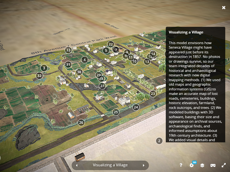 That interest has continued to today. Just this year, George Mason University’s Roy Rosenzweig Center for History and New Media awarded the American Historical Association’s Roy Rosenzweig Prize for Creativity in Digital History to the Envisioning Seneca Village project.[20] Roy Rosenzweig, who I came to know first as the author of the landmark works The Park and the People and Eight Hours for What We Will, is perhaps best known for his pioneering work in digital history. A social and labor historian and activist, his legacy is bringing history to the people who he championed. The prize, an award for innovation in digital historical work, is awarded annually to emerging projects. This year’s winner is an interactive 3D model with supplementary materials, which will soon feature a soundscape. RRCHNM Director Lincoln Mullen stated that Envisioning Seneca Village was selected as the prize winner because it “follows in Roy Rosenzweig’s footsteps not only in subject but also in its innovative use of new media to present history.”