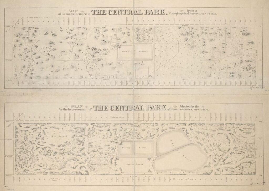 Figure 1: Egbert Viele, “Map of the lands included in the Central Park, from a topographical survey, June 17th, 1856; [Also:] Plan for the improvement of the Central Park, adopted by the Commissioners, June 3rd, 1856,” Lionel Pincus and Princess Firyal Map Division, The New York Public Library Digital Collections, http://digitalcollections.nypl.org/items/6850fc74-5e61-8806-e040-e00a18067a2c. The above map is a topographical survey of what existed in the park land before construction. The below map is a proposed map for the new Central Park. What was then Seneca Village can be seen in the above map on the top right corner of the Reservoir