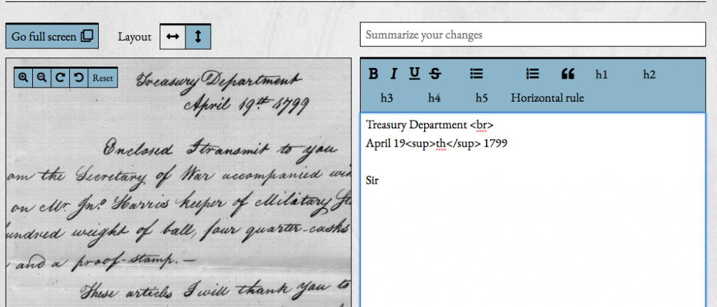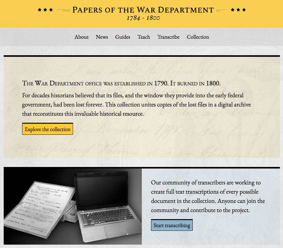The Papers of the War Department 1784-1800 digital editorial project has officially relaunched with a fully redesigned user experience. This project began in 1993, when Ted Crackel and a team of researchers worked for nearly a decade to piece together the records of the War Office that burned in 1800, destroying everything inside. You can read more about the history of the War Department here. In 2006, RRCHNM took over the project, and moved the collection from CD-ROM to the web. In 2011, RRCHNM developed Scripto, a community transcription tool that allows users to transcribe the over 40,000 items in the collection.