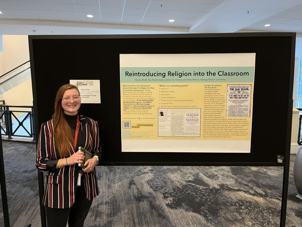 Hayley Madl was on the program twice, presenting her poster “Reintroducing Religion into the Classroom,” which she worked on in collaboration with Nate Sleeter*,* and taking part in the roundtable “Pieces of Podcasting You Don’t Know About but Should.” At the roundtable, Hayley discussed how important accessible show notes and transcripts are to reaching diverse audiences for historical podcasts.
