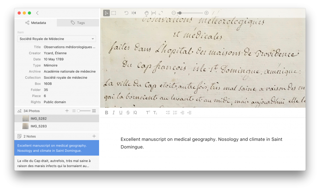- Attach notes or transcriptions to your photos, or to a selection from a photo
